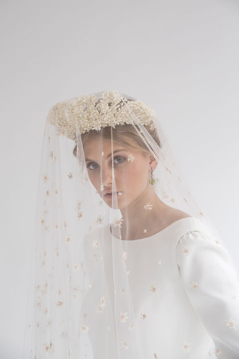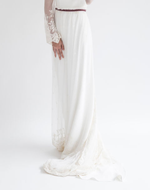 This collection, with apparently simple lines but with rich craftsmanship, stands out for the quality of the fabrics. Embroidered tulles that play with textures, silk georgette and crepe that continue to play a leading role.